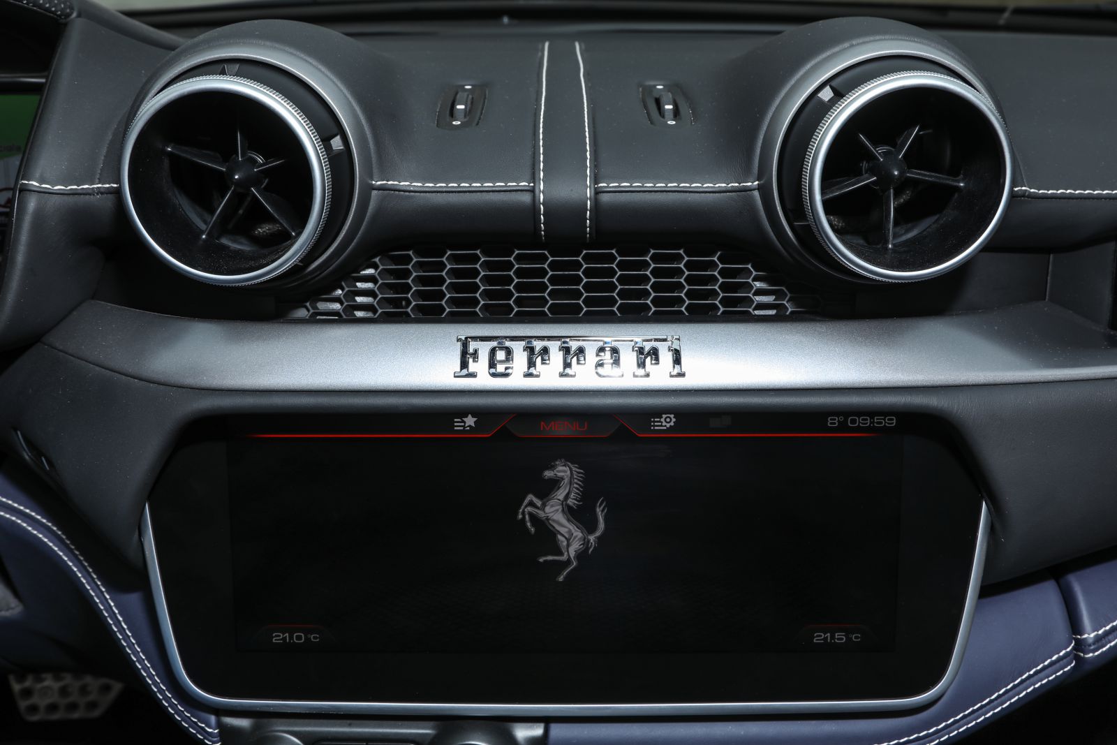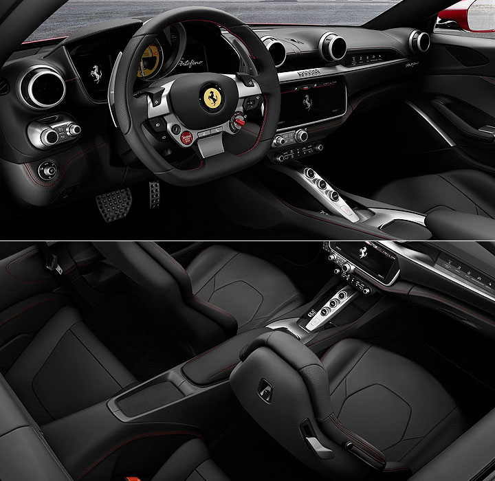 座艙內,Ferrari Portofino 則是導入 GTC4Lusso 的內裝設計風格,搭載 18 向可調電動座椅及 10.2 吋的中央觸控娛樂資訊與空調系統,並增加了後座乘客的空間。此外,座椅後方的導風板也搭載新設計,可將車艙內的氣流量減少 30%、降低風切噪音。
